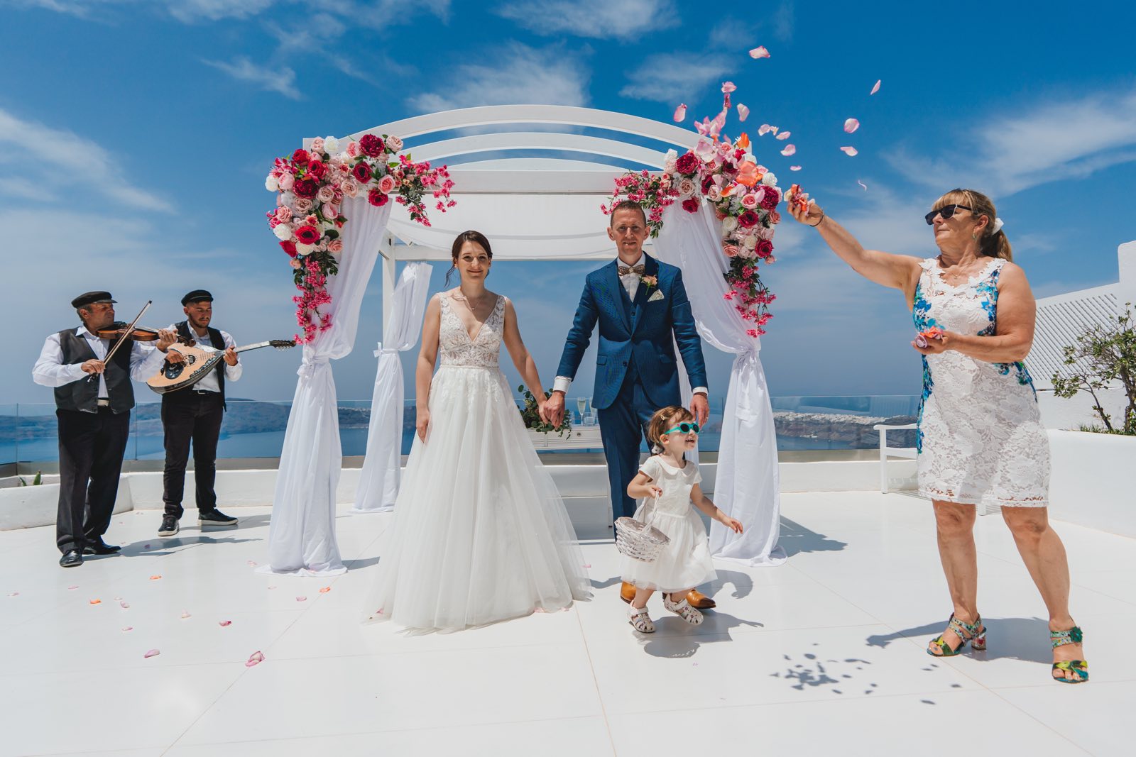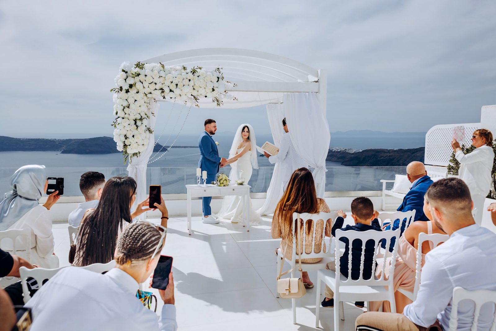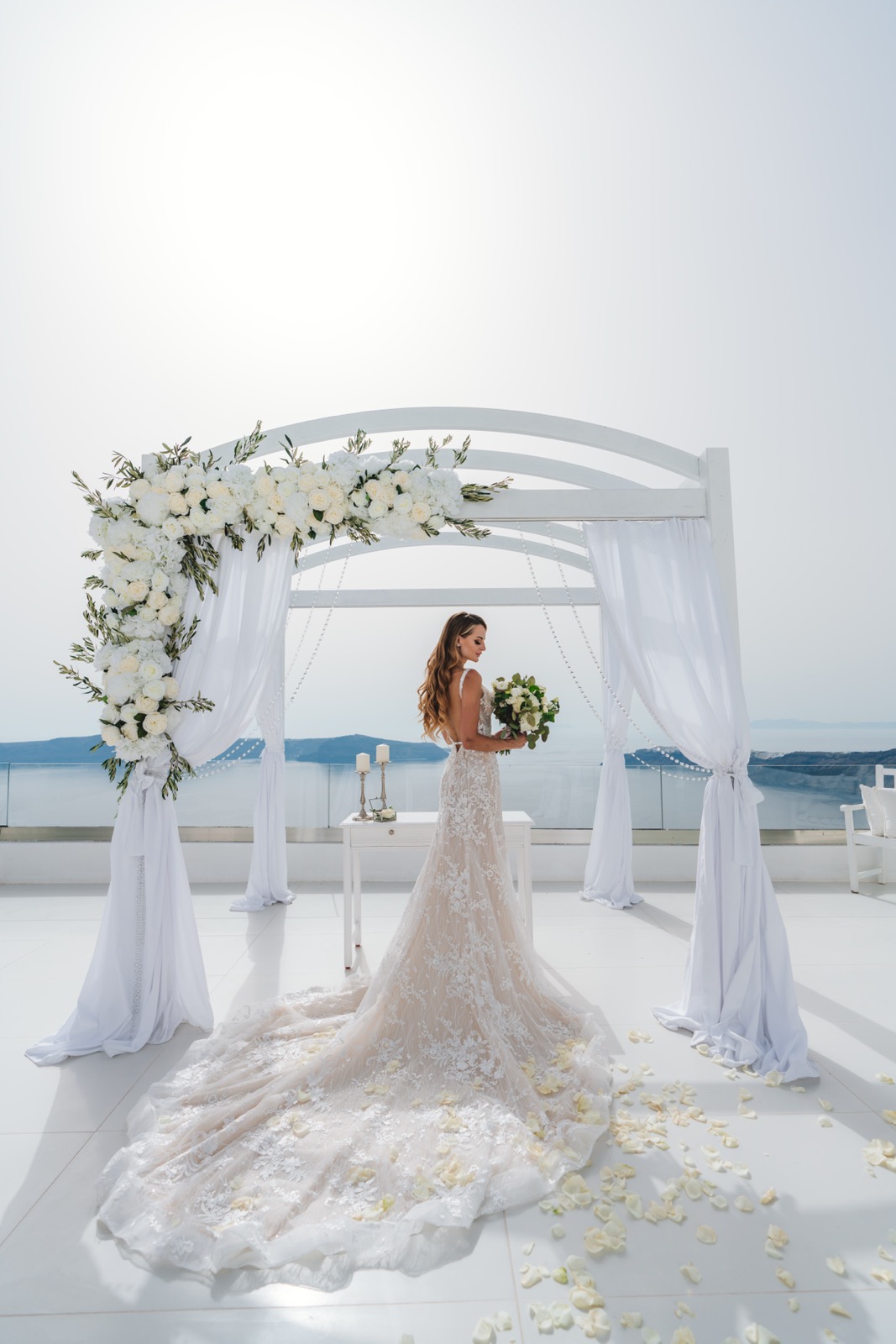 ”Andromeda villas” is a classic white terrace for ceremonies with a beautiful sea view. To date, this wonderful wedding venue has become the most beloved for the newlyweds. And this is quite understandable: affordable by the standards of Santorini, the rental price, coupled with an impressive snow-white interior and a favorable location on the slope of the caldera, puts it in the first places for celebrating both cozy weddings “for two only” and chamber celebrations with relatives and friends. Another small weddin venue for intimate ceremonies has also opened on site. The ceremonial terrace “Andromeda villas” occupies part of the territory of the boutique hotel of the same name in Imerovigli, a traditional village on the western rocky coast of Santorini, dotted with beautiful mini-hotels in the classic Cycladic style. From here, the newlyweds and their guests have a breathtaking view of the entire Santorini caldera from a height of 300 meters above sea level. In addition, here the newlyweds and their guests are provided with almost 100% privacy, which makes it possible to hold very romantic wedding ceremonies here, as well as to arrange exquisite candlelight dinners only “for two”. The presence of its own restaurant at the hotel provides an opportunity to organize here, without leaving the hotel, a gala dinner and a banquet for companies up to 50 people. This is a great option when both the ceremony and the aperitif after it, and dinner can be held in one place! At the same time, the newlyweds have two indoor restaurant areas to choose from, one of which has a magnificent view of the sea. And the buffet after the end of the ceremony will be organized right on the ceremonial site, where a small bar counter has been prudently built.