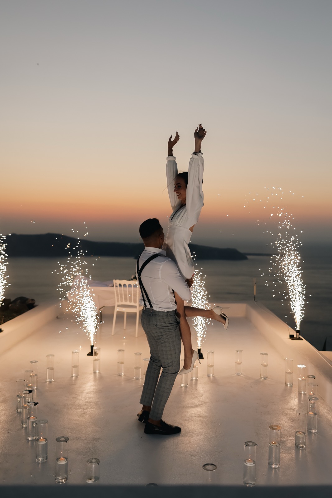 To continue the evening program, we suggest you consider organizing dinner directly on the territory of the Andromeda villas hotel, a few steps from the wedding venue. It can be a cozy indoor hall of the hotel's own restaurant or a glazed terrace adjacent to it, or the balcony for outdoor dinner, from where magnificent views of the sunset will open. If you are planning to fly to Santorini as a couple, then we recommend that you arrange a romantic dinner right in the ceremonial gazebo, where you will be offered 3 menu options from 4 courses and the best representatives of Greek wines